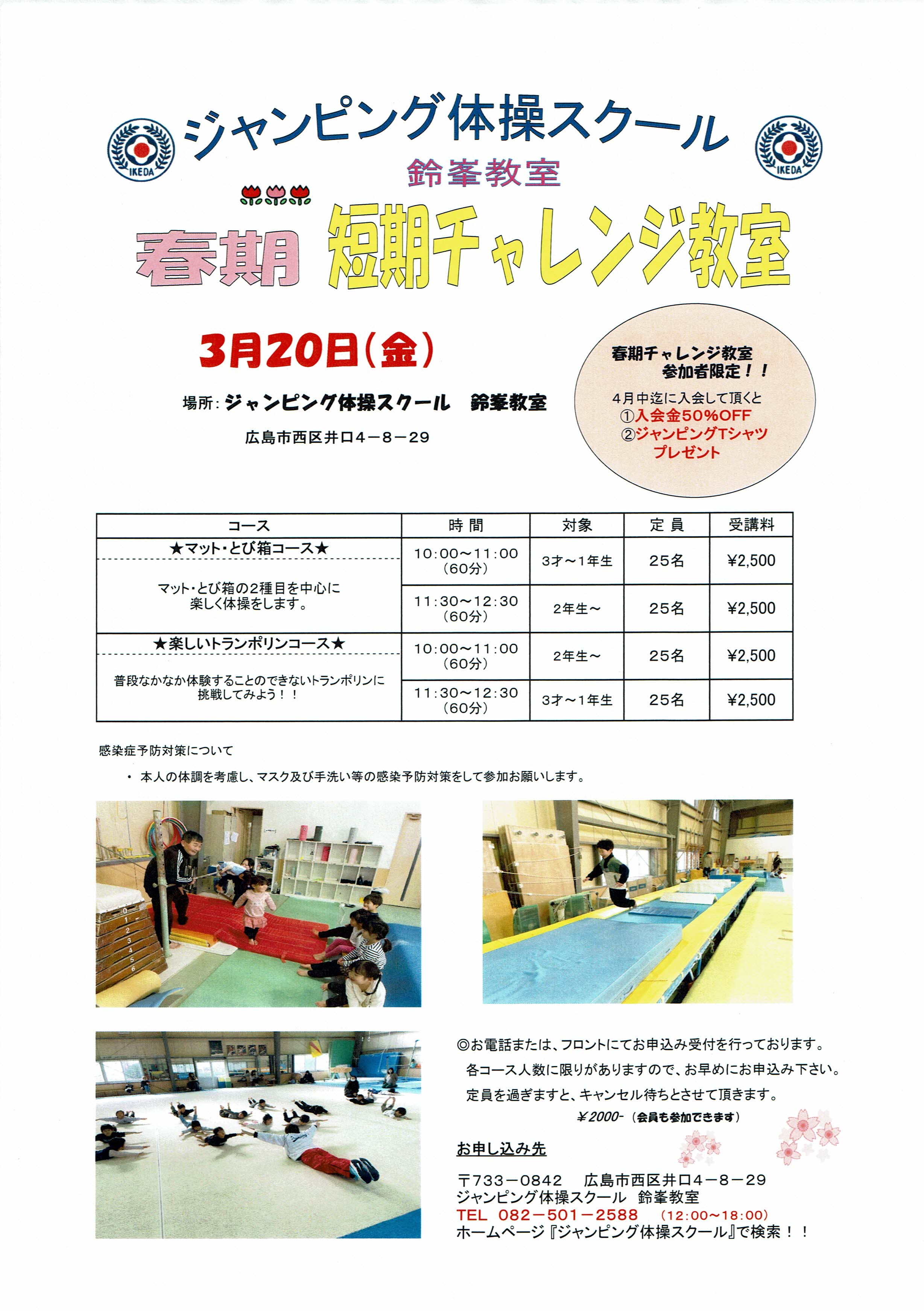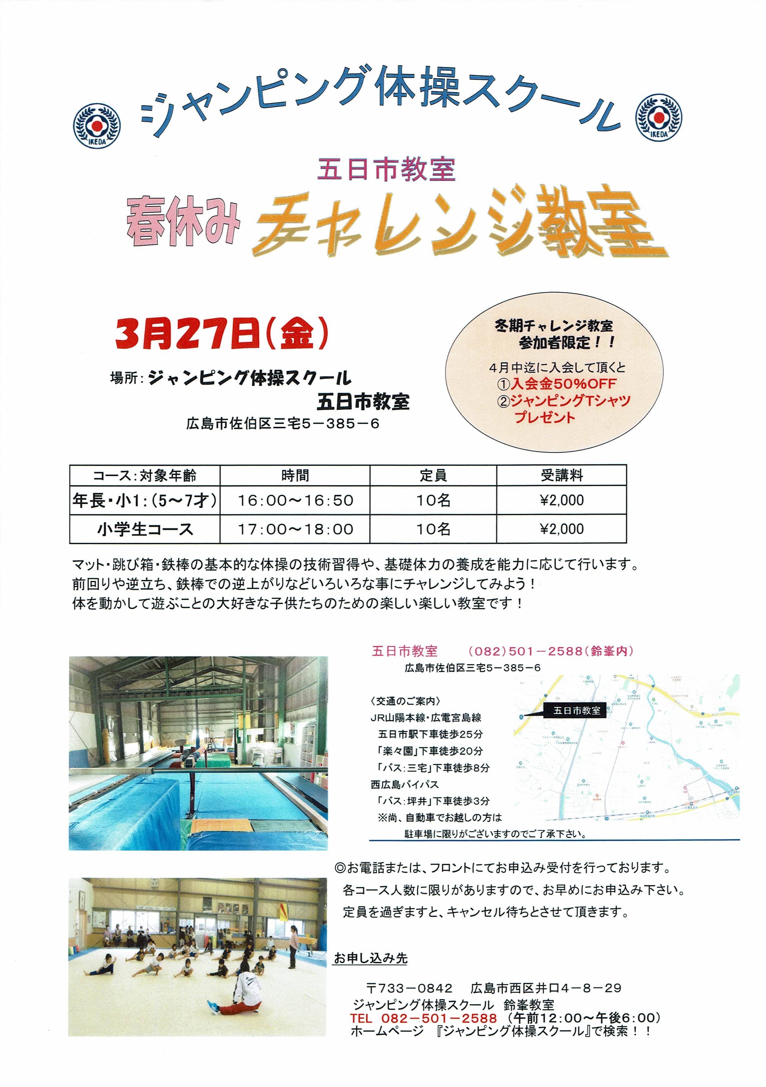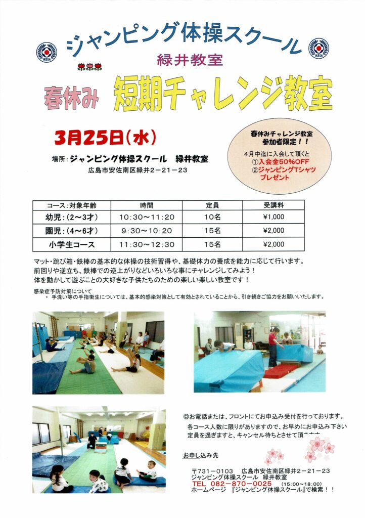 Home › お知らせ › 春期チャレンジ教室(鈴峯3/20・緑井3/25・五日市3/27) 2025-10-15 春期チャレンジ教室(鈴峯3/20・緑井3/25・五日市3/27) 関連記事 演技の後体験会をしました。 全日本ジュニア体操競技選手権大会 その2 みんな素晴らしい笑顔です。 西日本ジュニア in兵庫 緑井教室 幼児クラス(随時募集中)(水)10:00~ 鈴峯教室インスタグラム 求人案内
